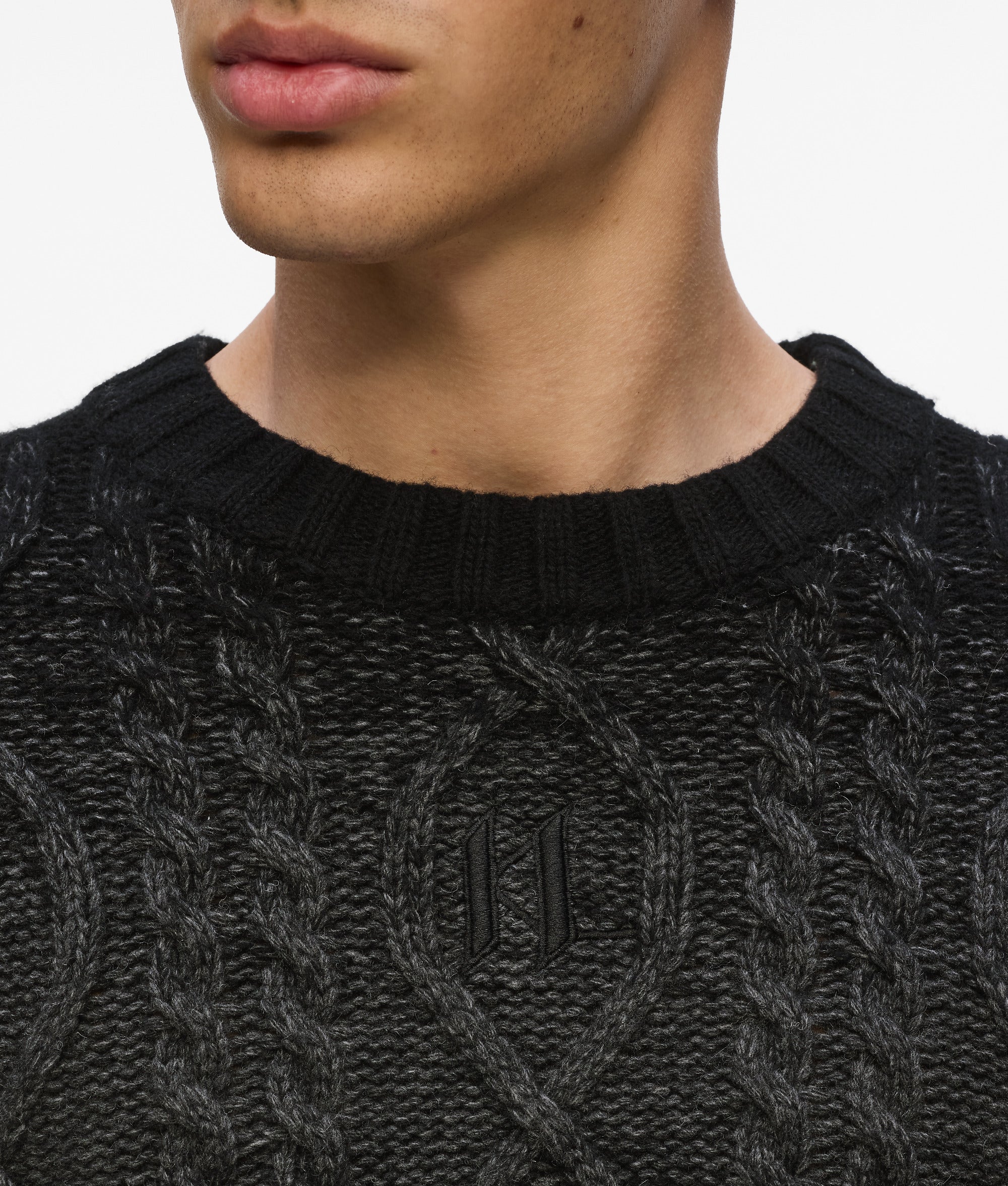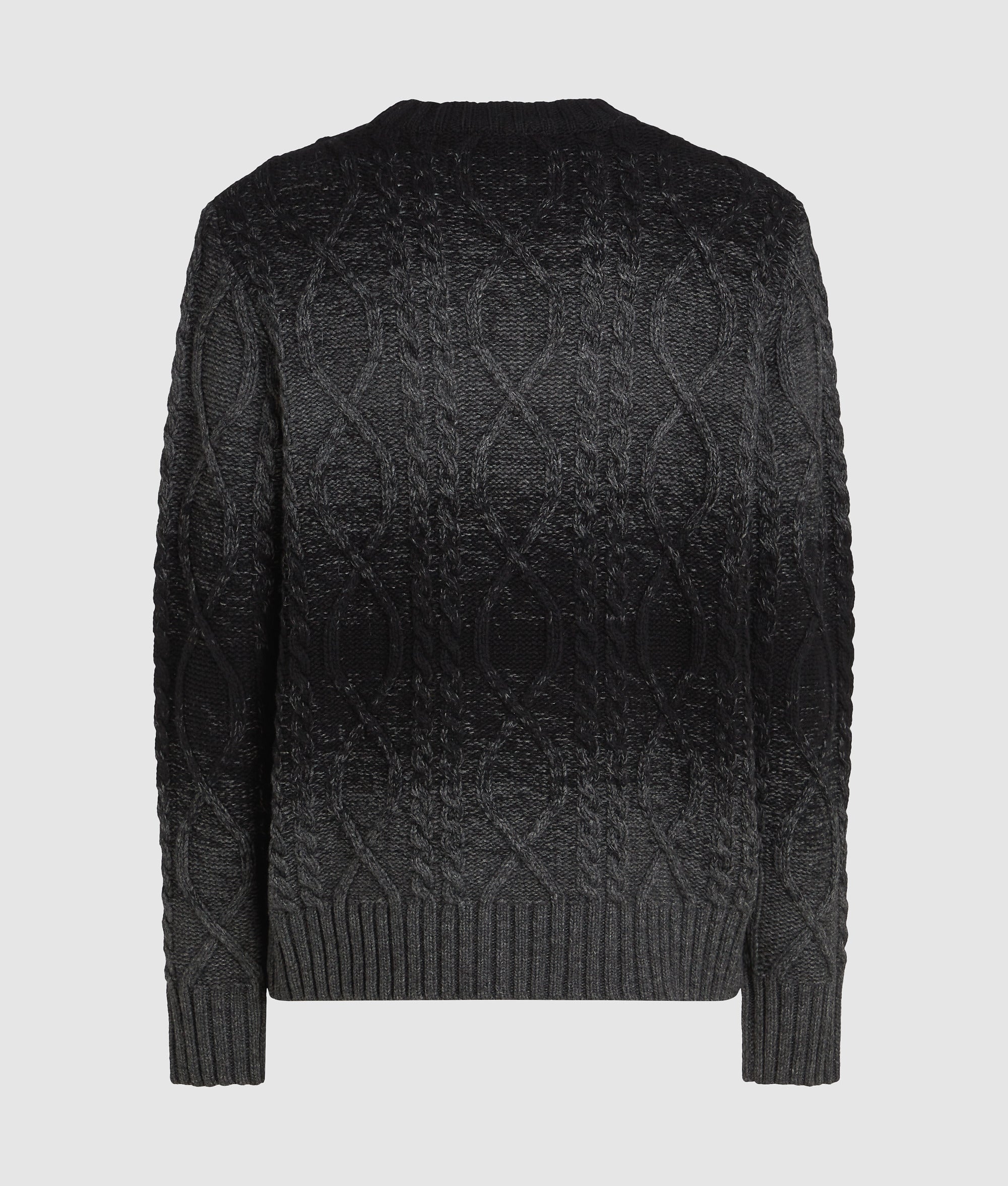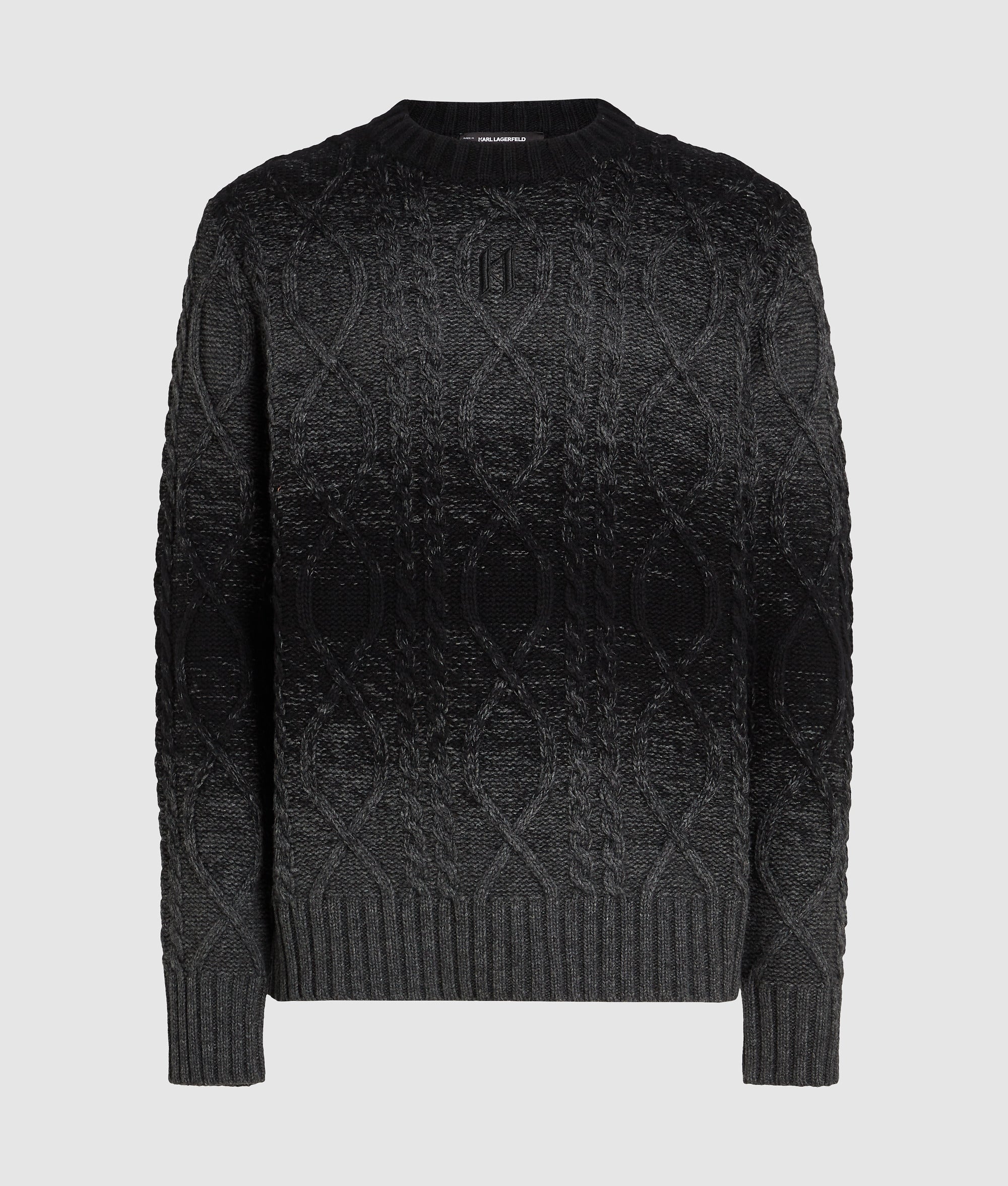 This cozy wool-blend sweater features a classic crewneck and cable knit with a degrad?? effect. making it a statement piece for chilly days. The tonal KL Monogram adds to its distinctive style.