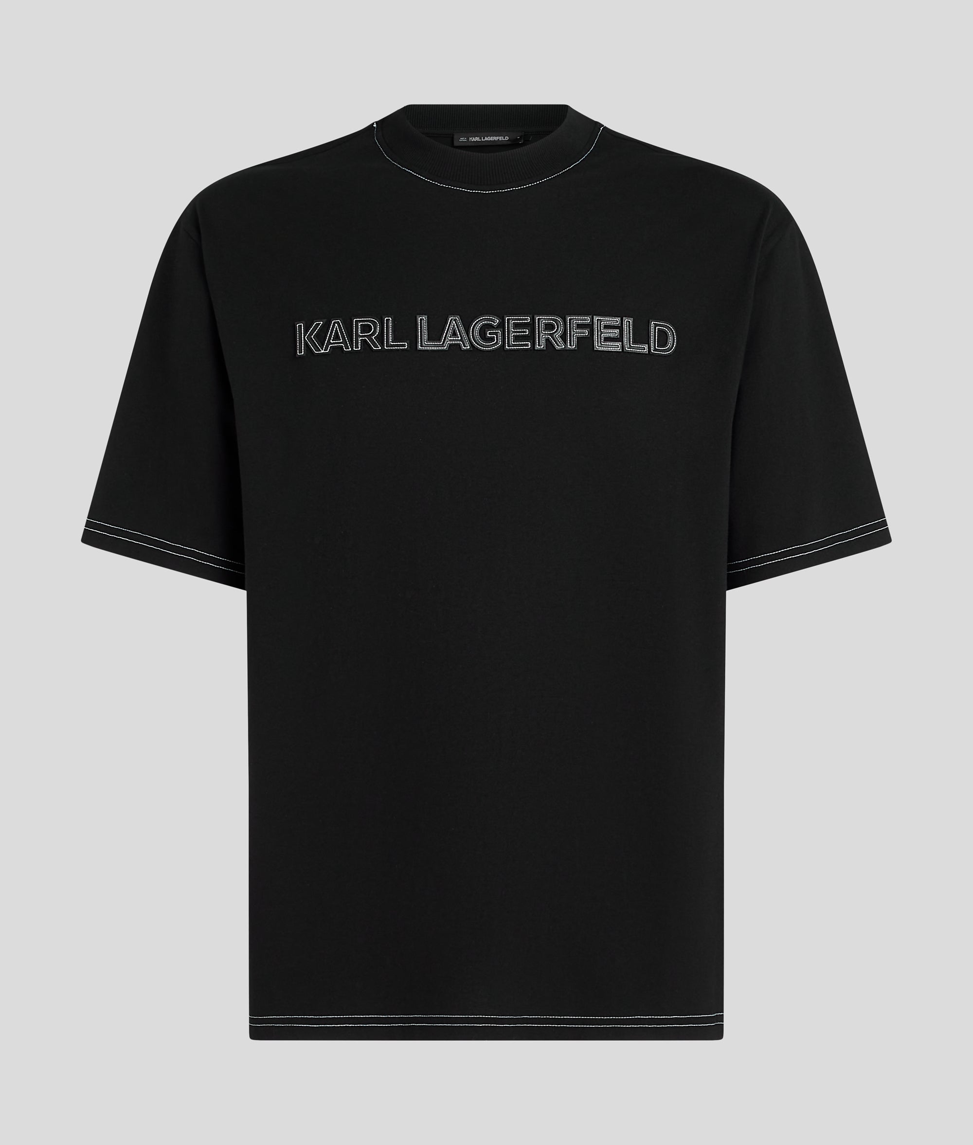 Featuring contrast stitching. this crew neck T-shirt redefines casual style. Bold KARL LAGERFELD logo artwork across the chest completes your statement look.