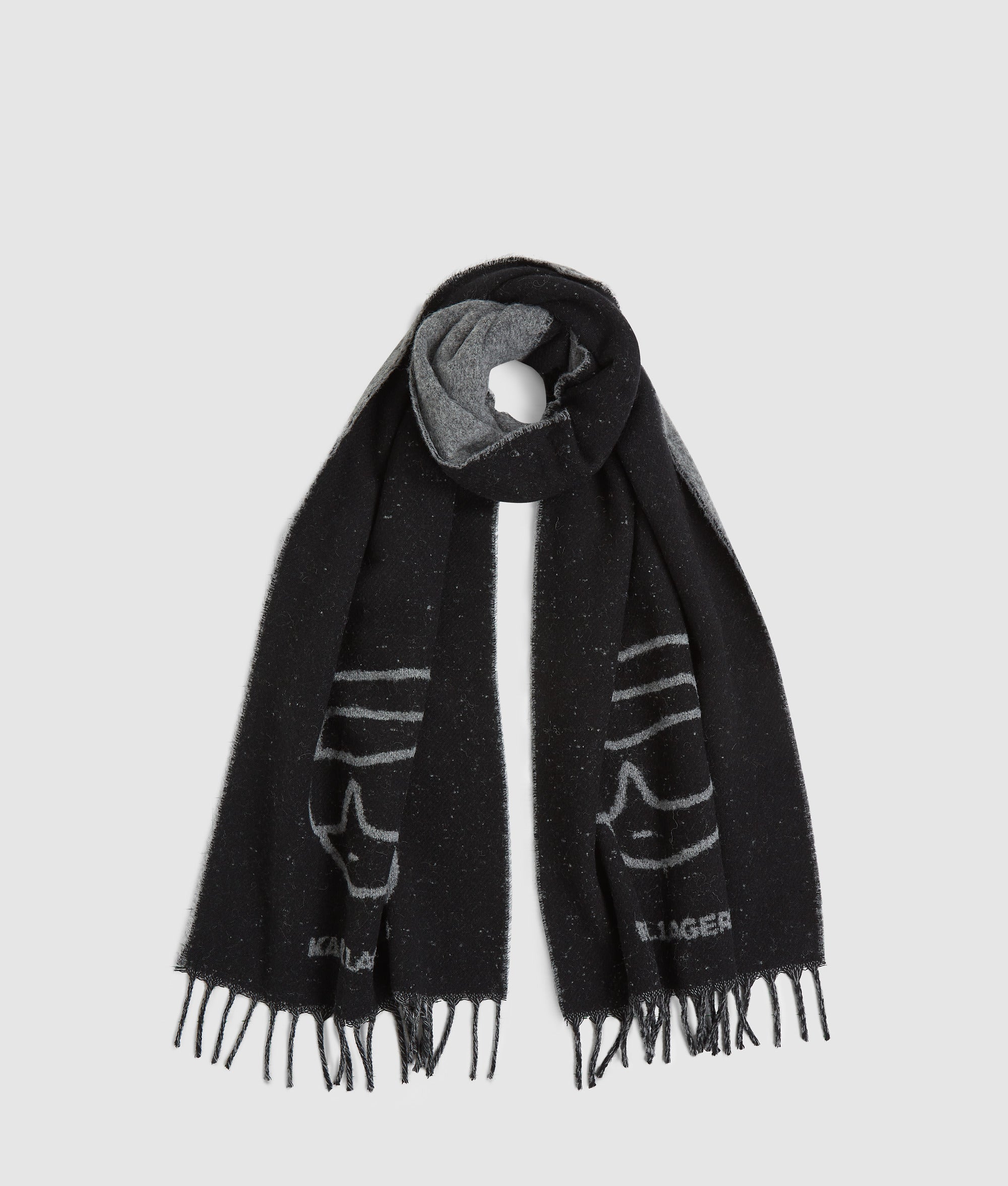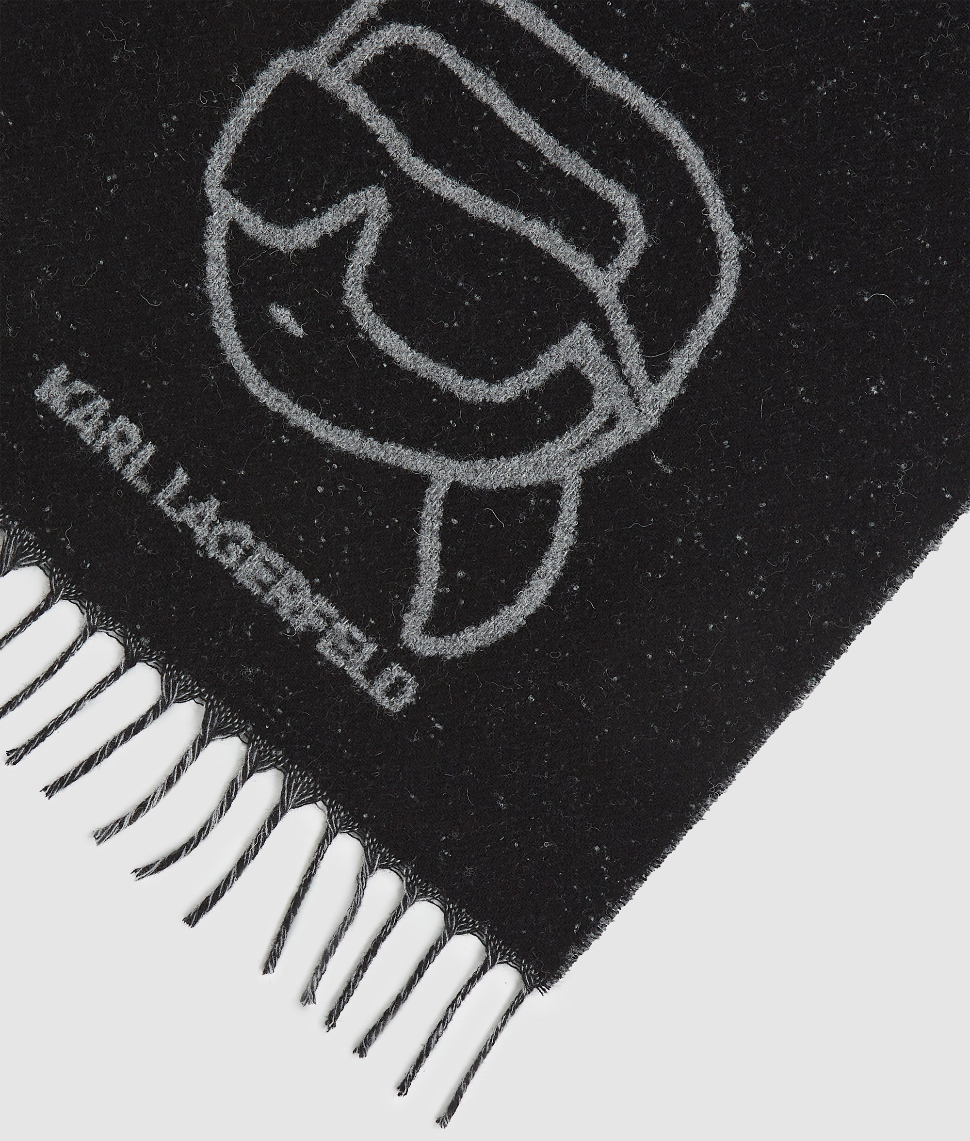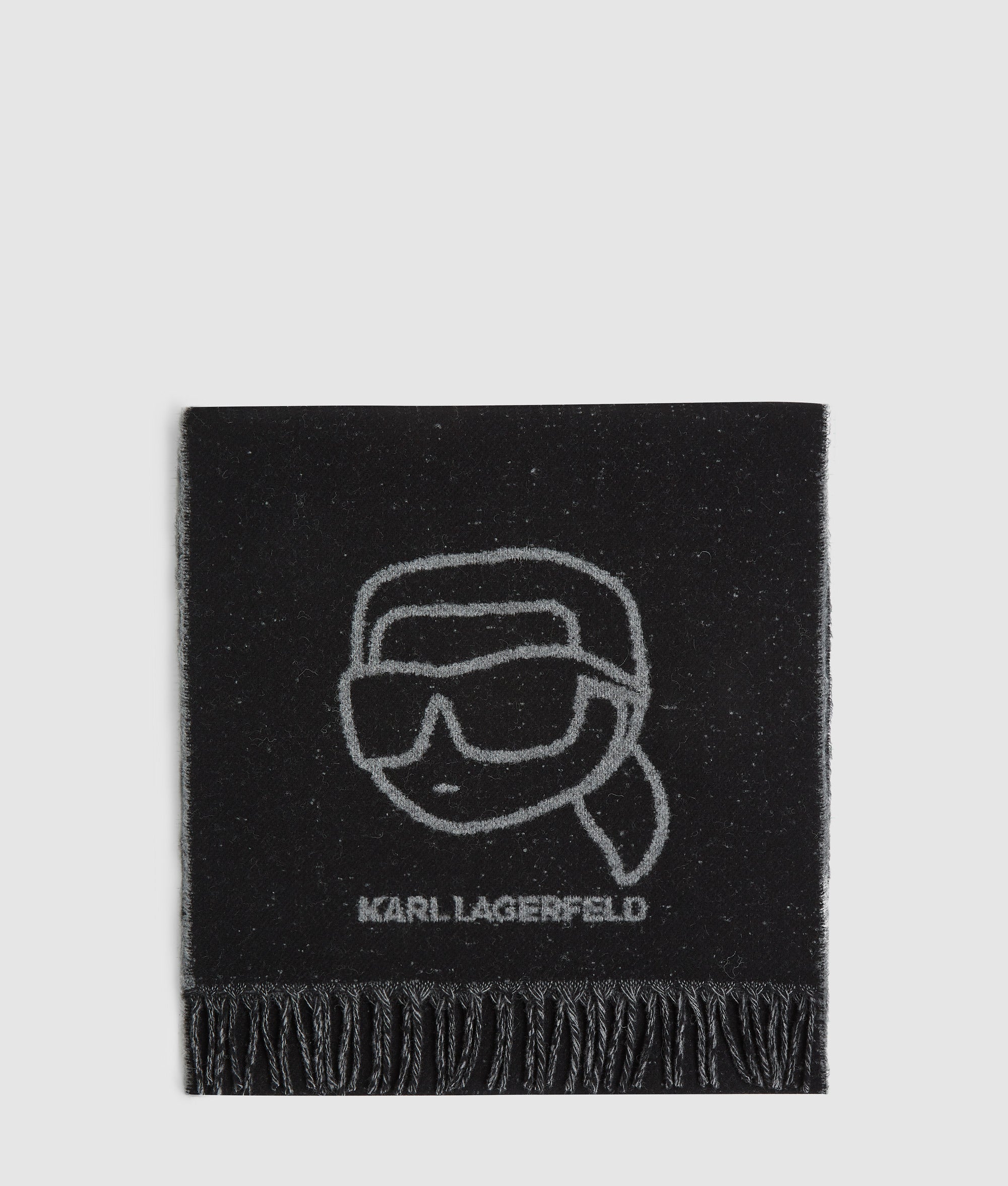 Add playful style to cold-weather looks with this cozy knitted scarf featuring fringe detailing and Ikon Karl artwork.?
