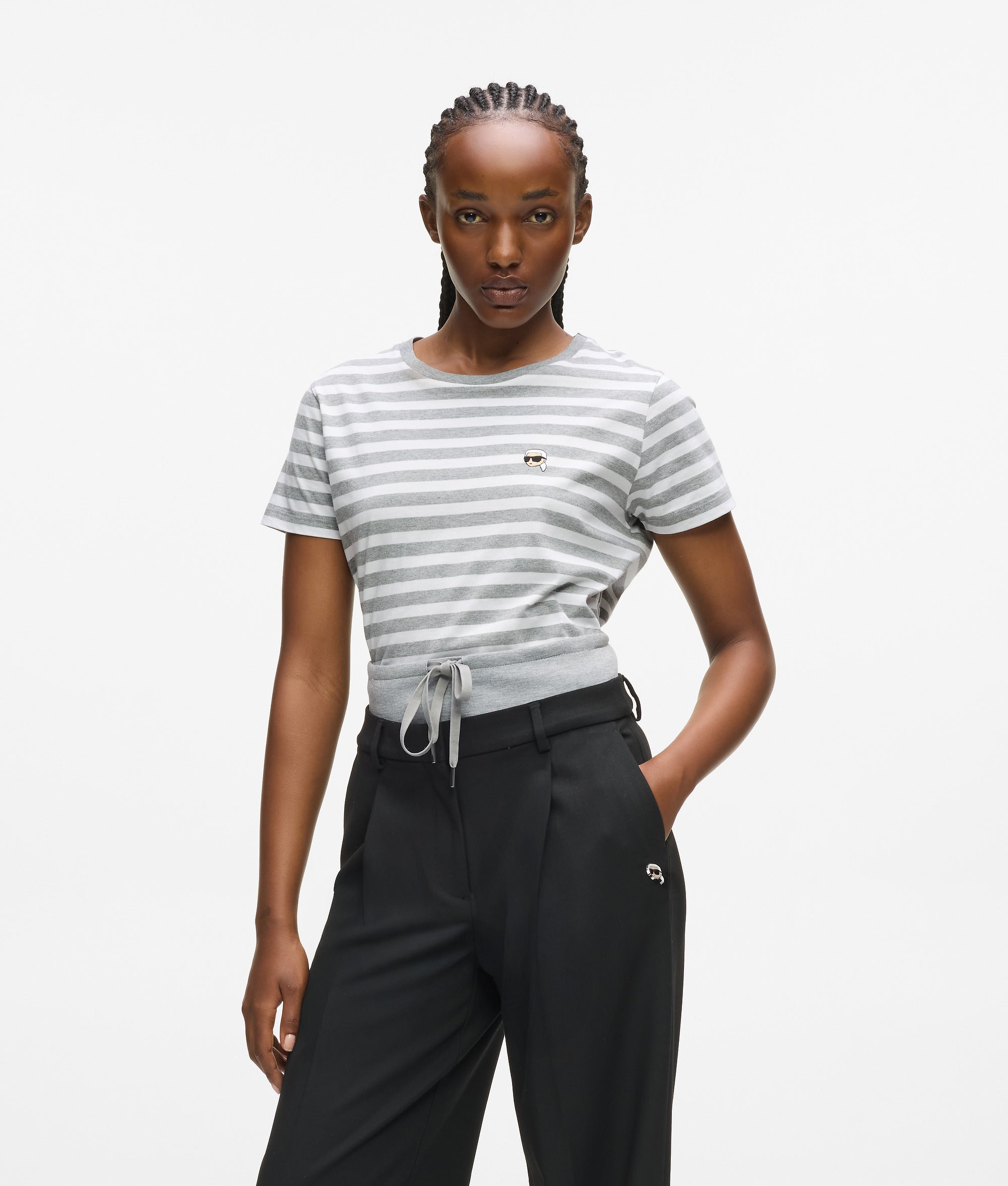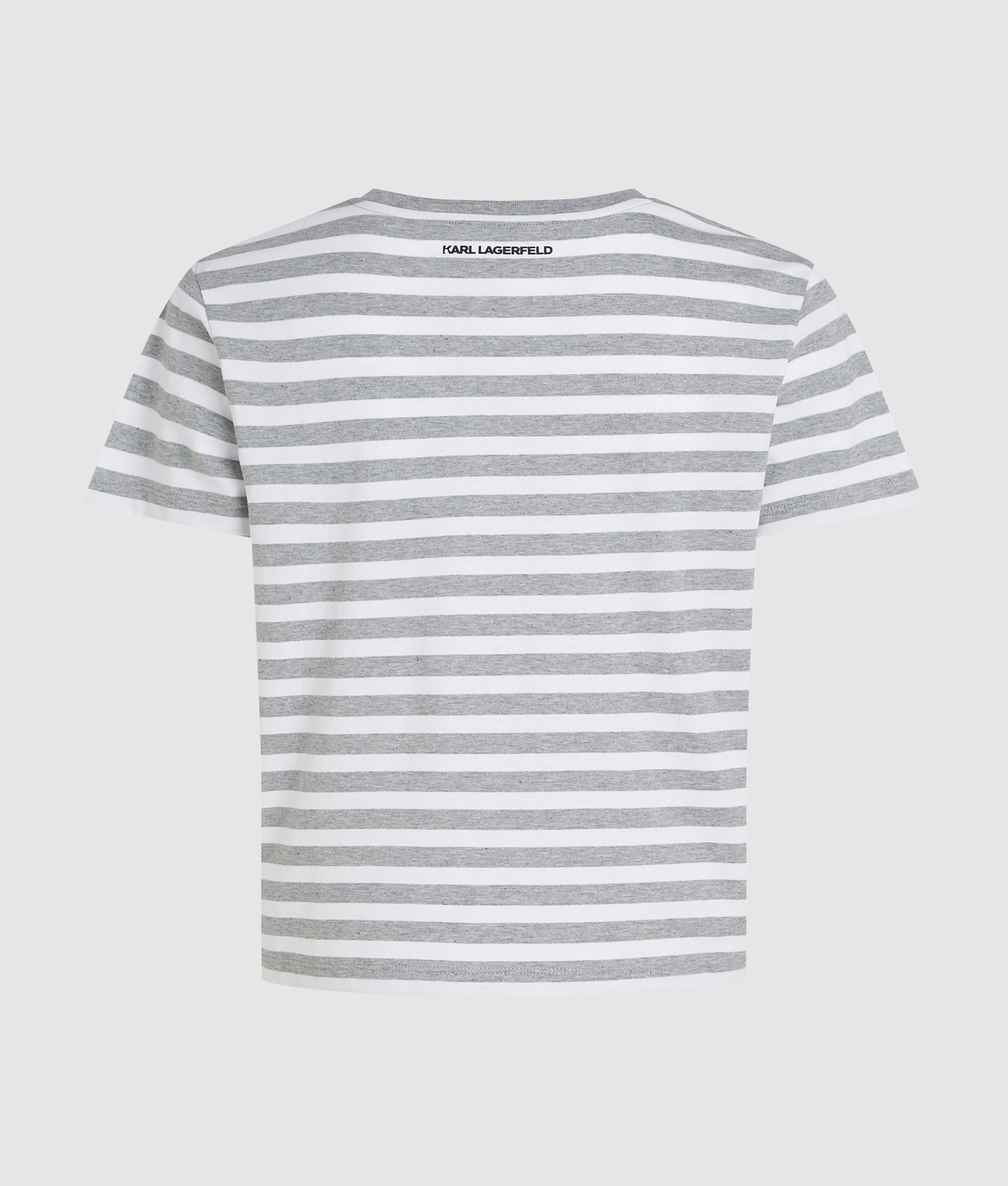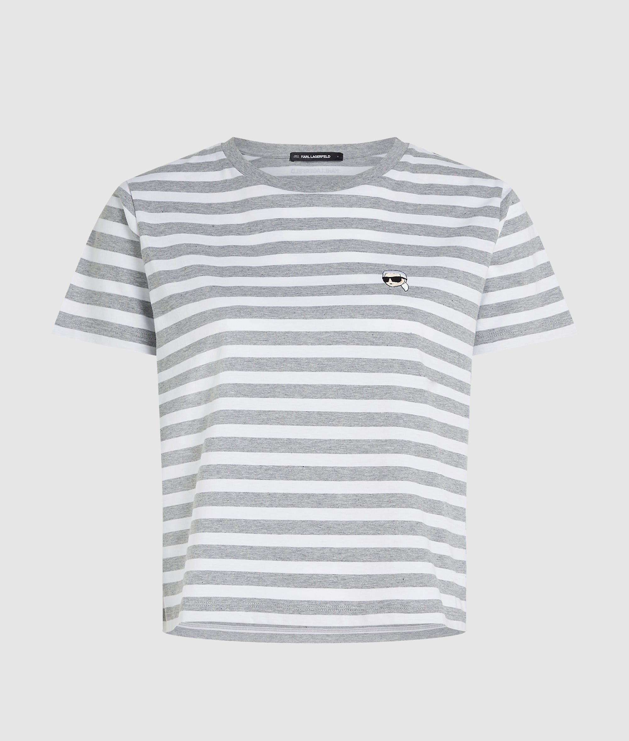 This crew-neck T-shirt with an embroidered Ikon Karl patch blends chic stripes with subtle artistic detailing for a refined. casual look.