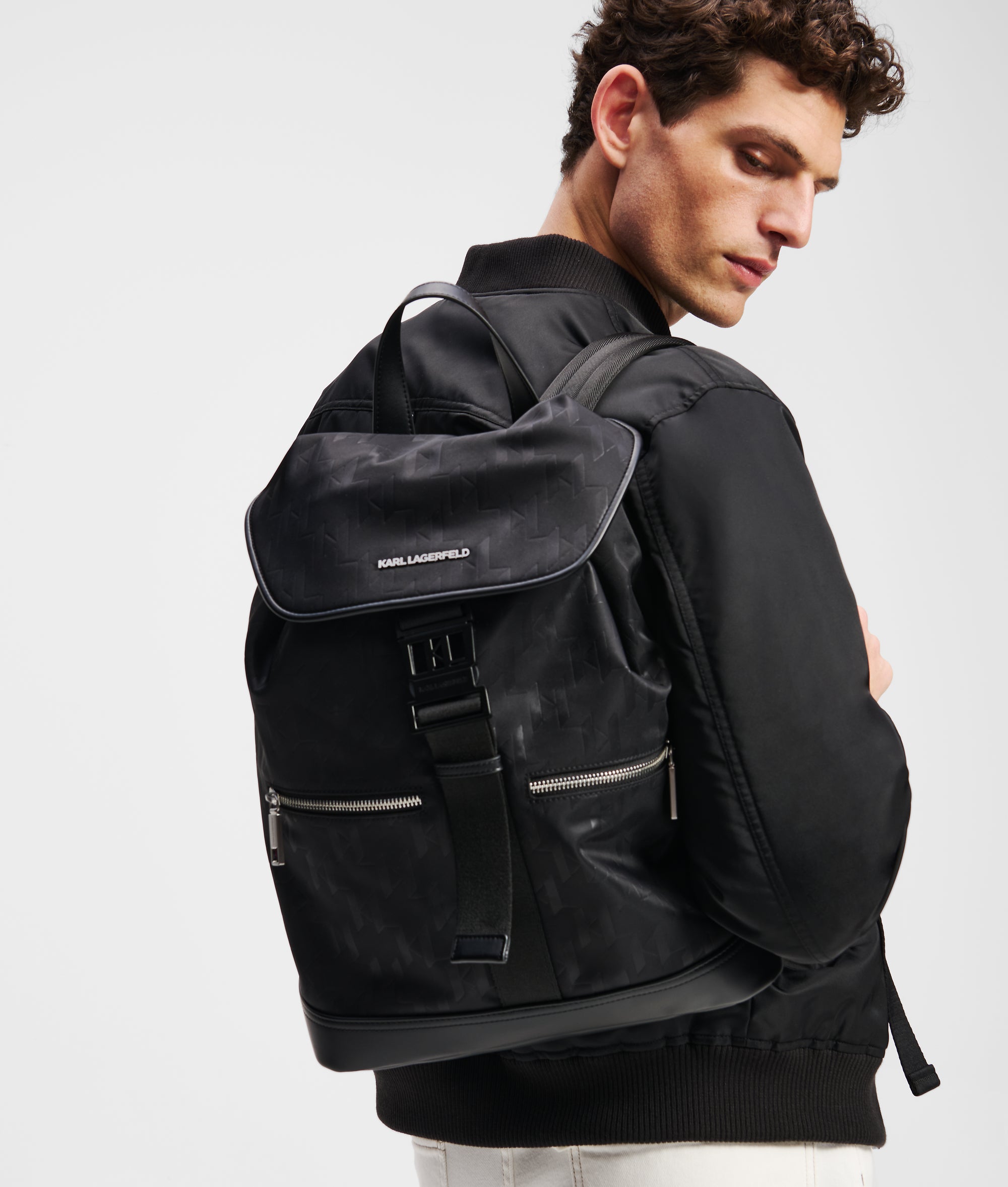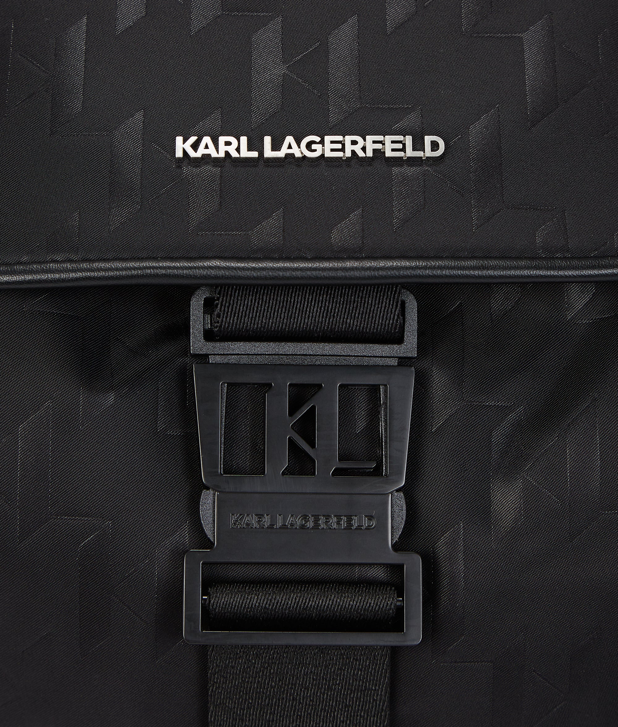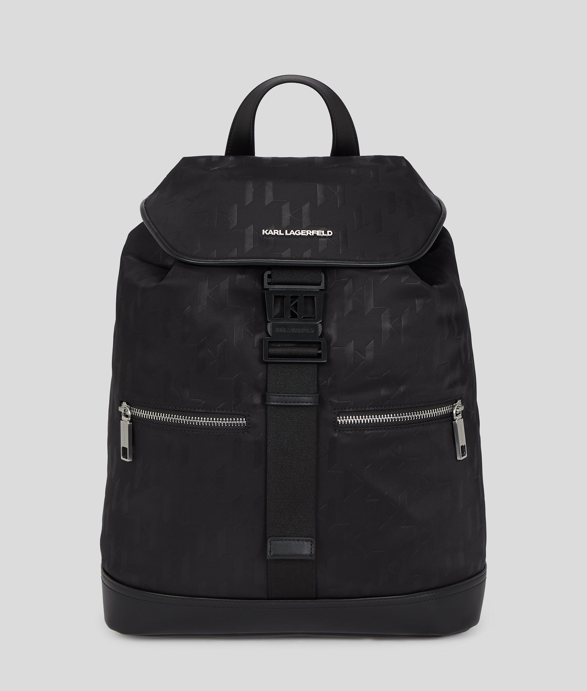 Introducing a sleek backpack showcasing an all-over Karl Monogram design. The buckle flap closure ensures your essentials stay secure. while multiple zipped pockets and an inner laptop compartment make organization effortless.