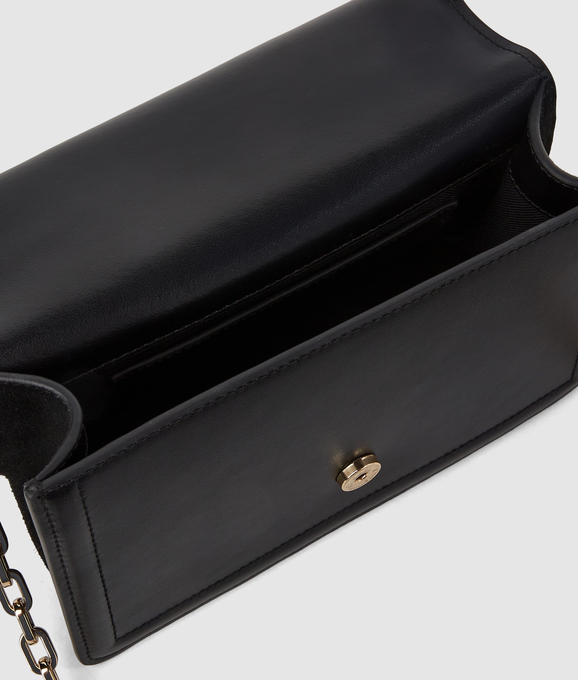 A petite crossbody bag with a sleek flap closure. crafted from soft leather with luxurious suede accents. Its adjustable strap with chic chain detailing offers versatile styling. while the look is anchored by a subtle KARL LAGERFELD logo.