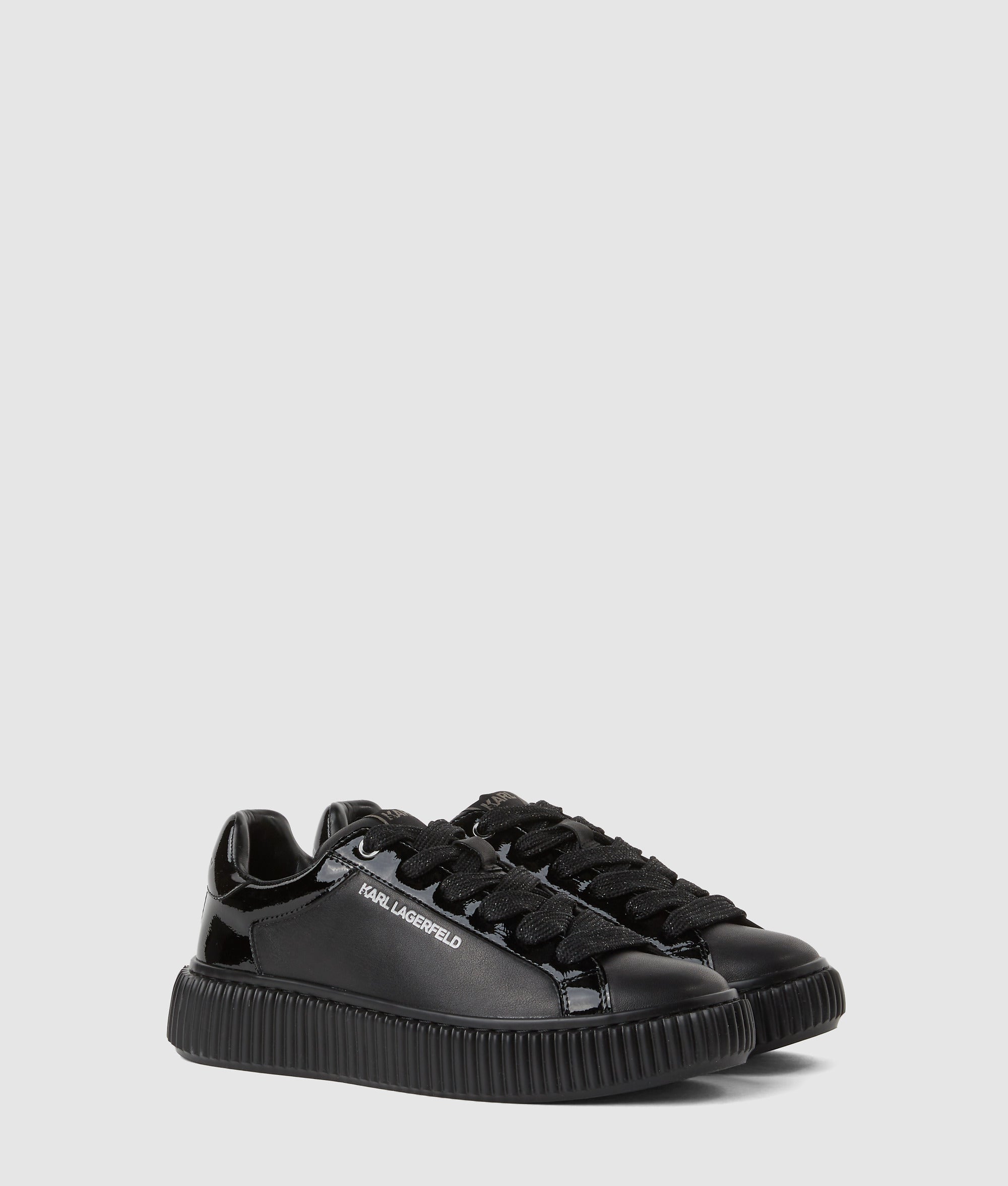 These lace-up sneakers effortlessly combine style and versatility. Crafted from sleek leather with a subtle. metallic KARL LAGERFELD logo embellishment. they pair perfectly with jeans or add edge to smart pants.