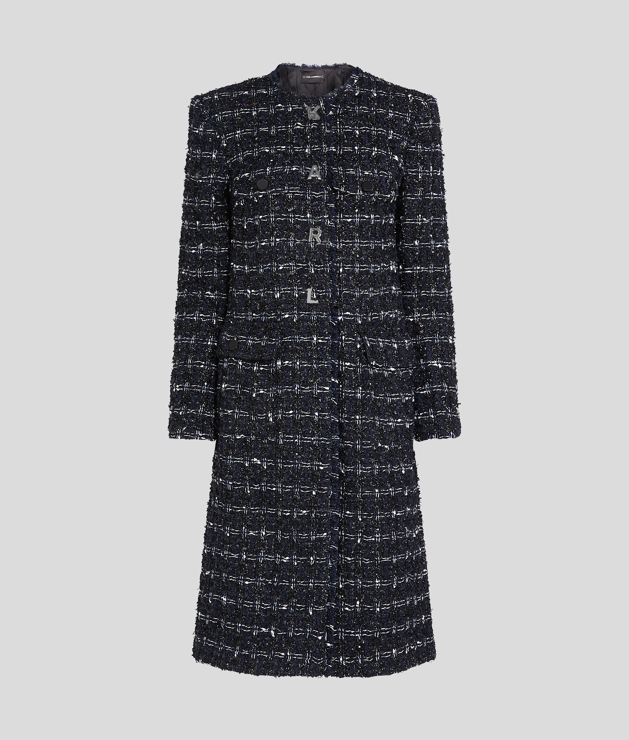 Exuding effortless elegance. this longline coat features a chic silhouette with structured shoulders. Textural frayed detailing at the collar and cuffs add a unique touch. while branded lining and KARL letters press studs enhance its appeal.