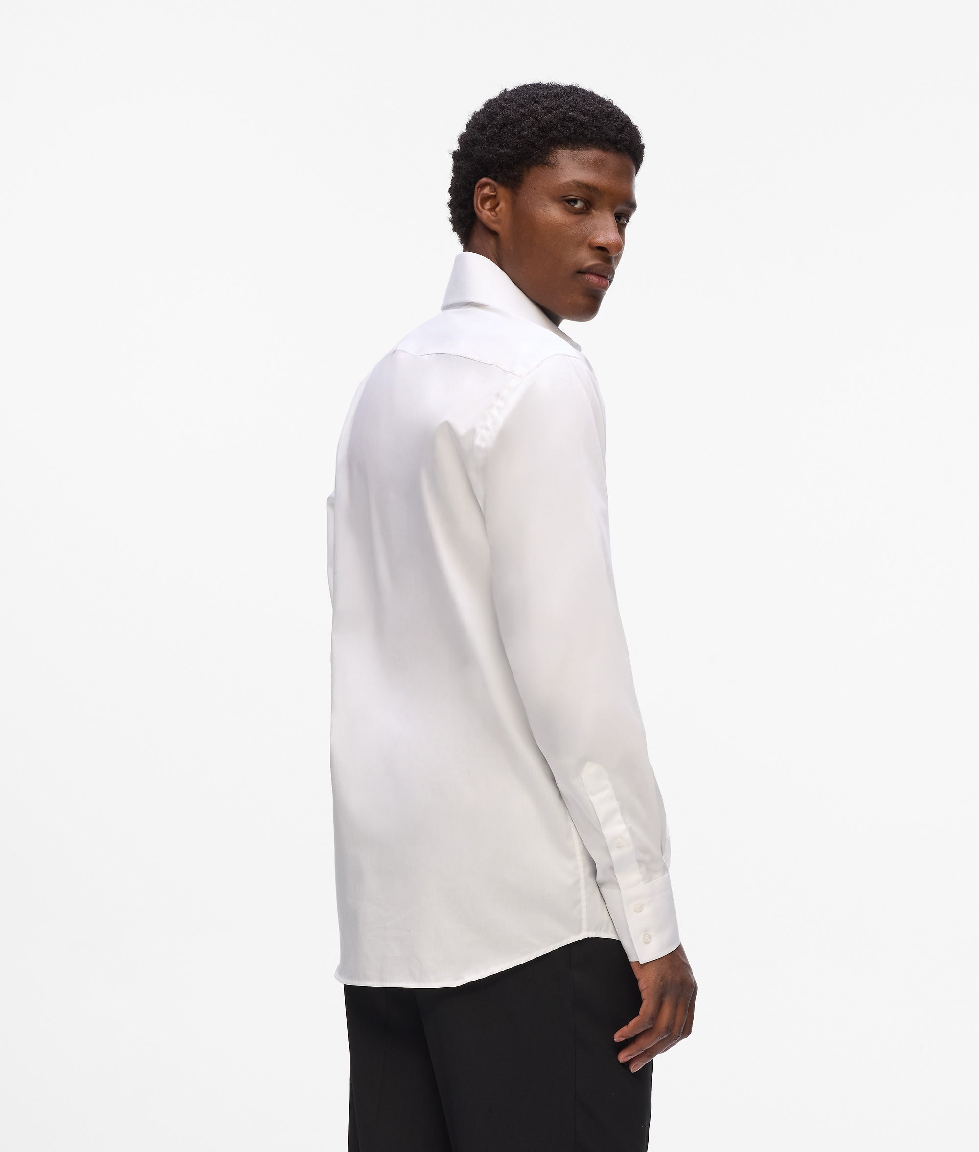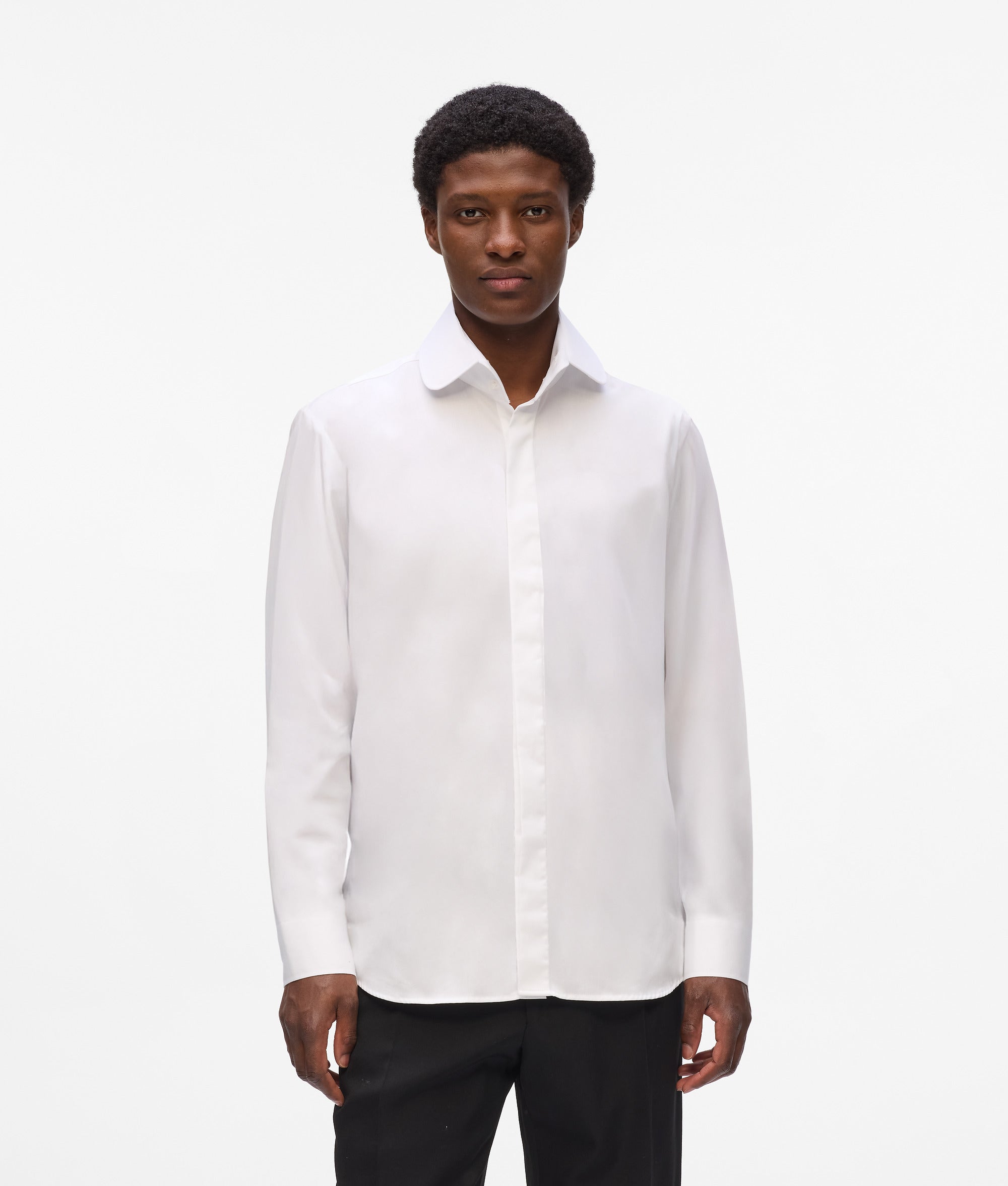 A woven shirt with a modern rounded collar and deep cuffs. subtly elevated by a discreet logo detail and a clean. concealed button front.