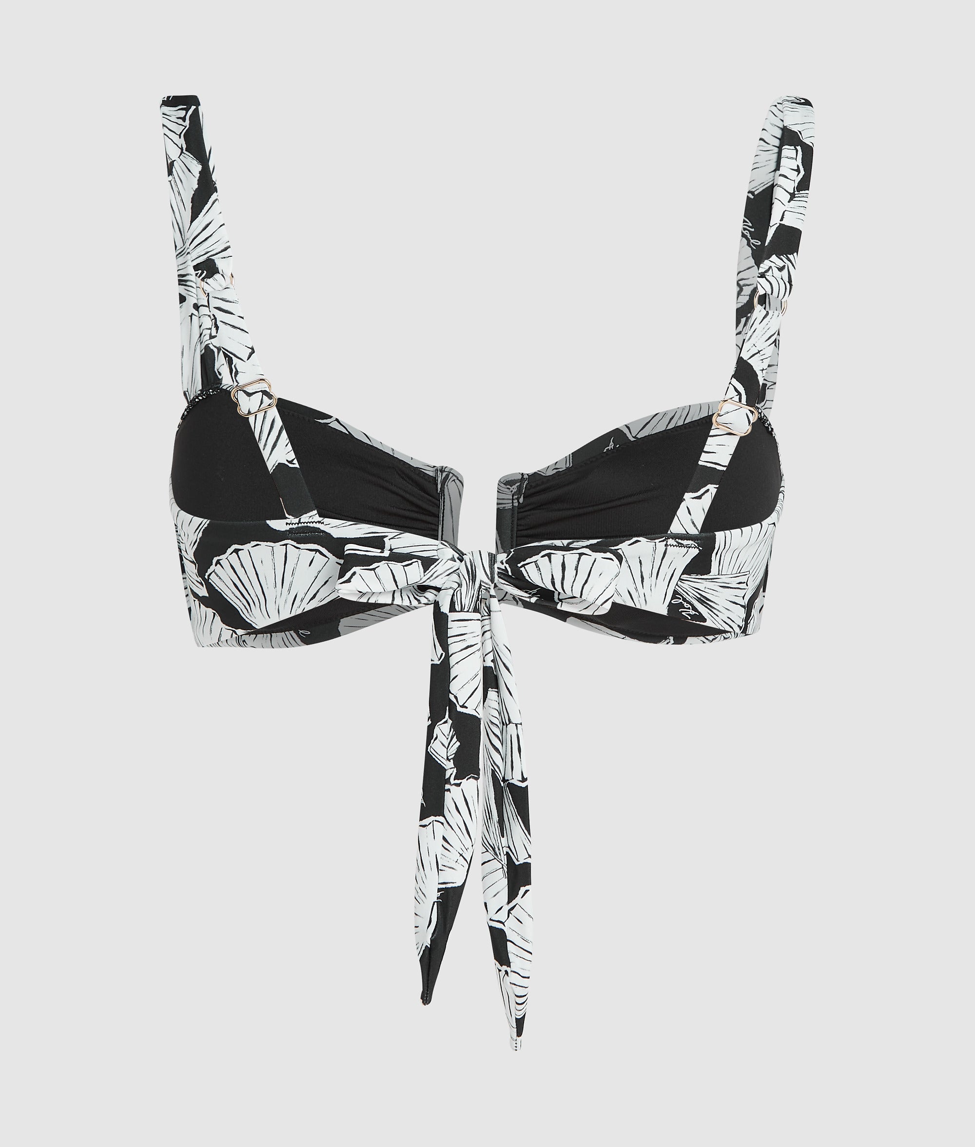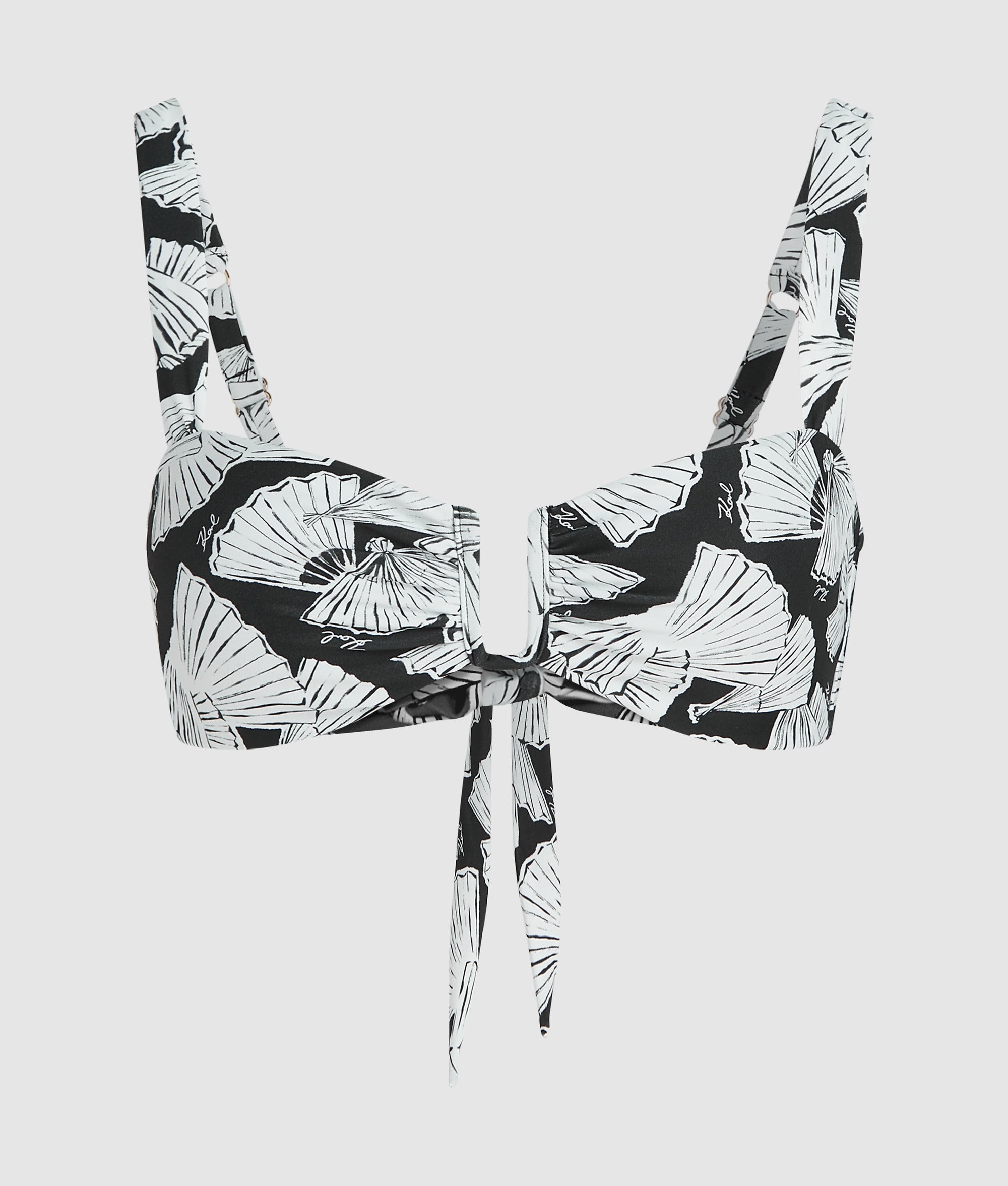A fan print bikini top with an elegant silhouette and U-wire detail offers refined shaping. Adjustable straps and removable padding ensure a tailored. comfortable fit.