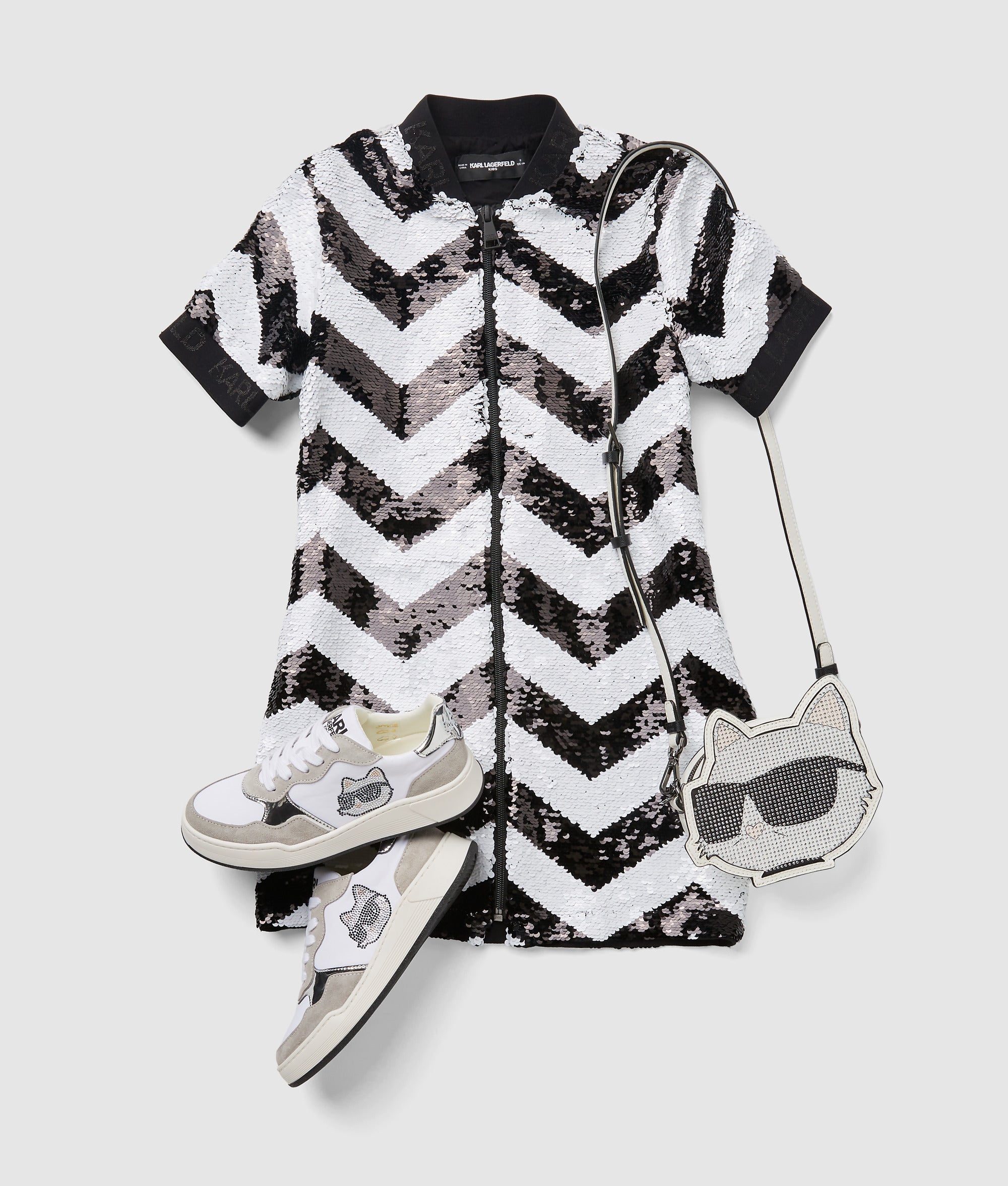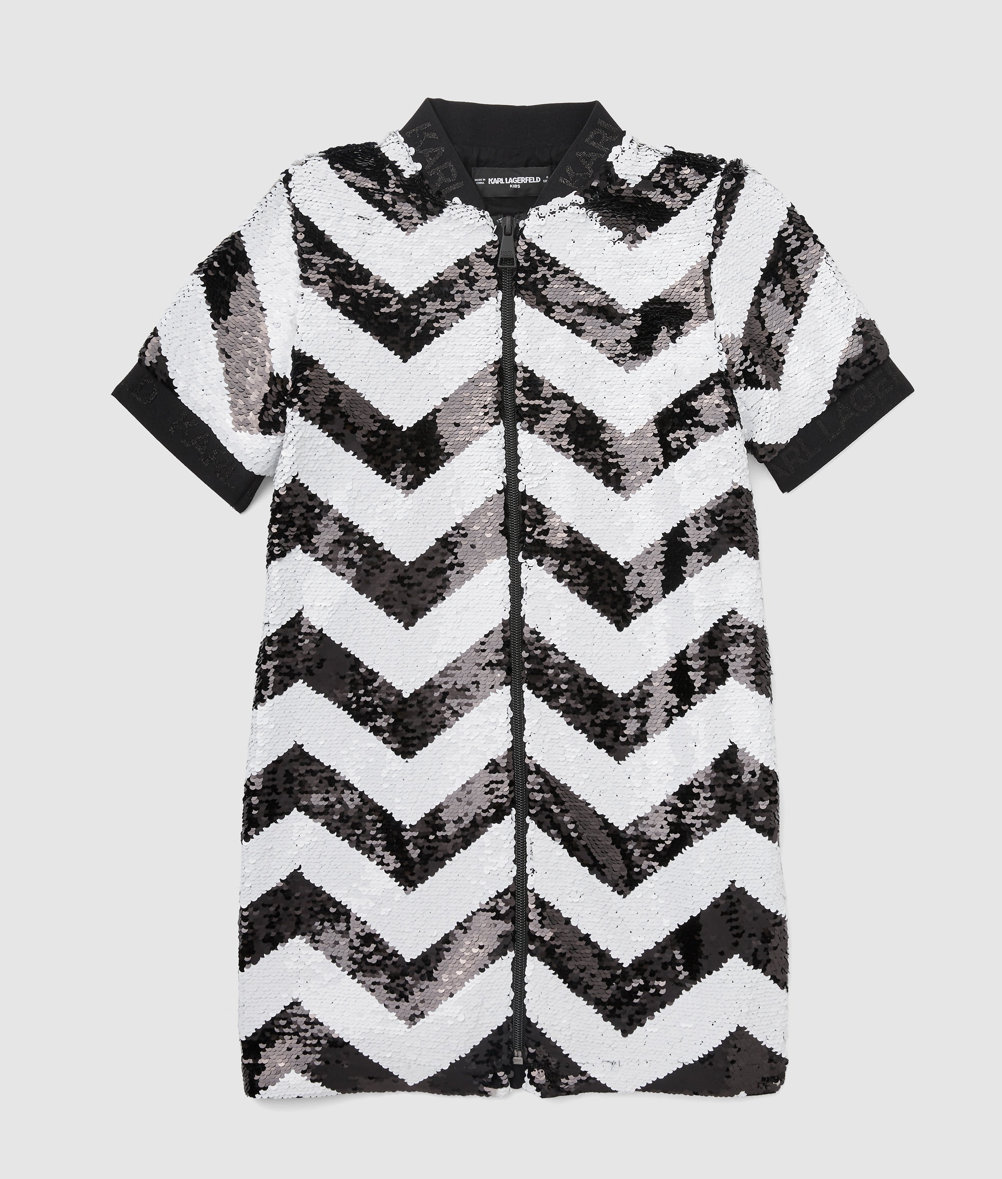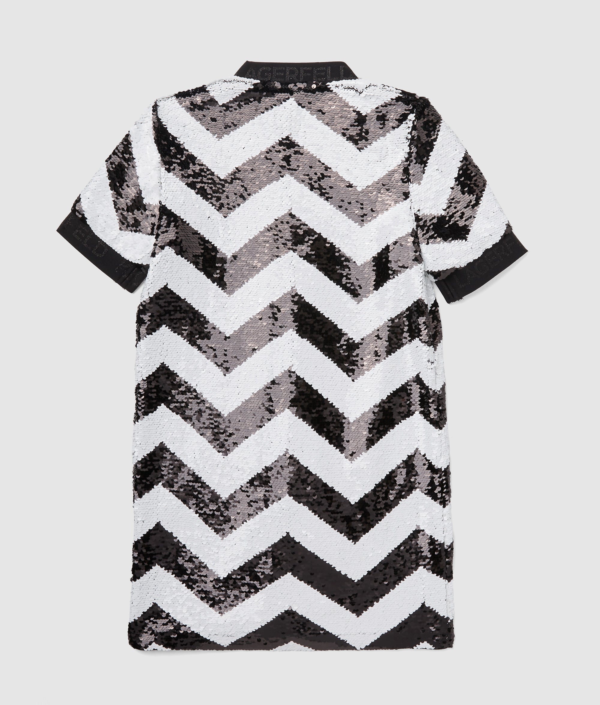 Zigzag-patterned sequins catch the light with every move in this short-sleeved dress designed for playful days and nights.
