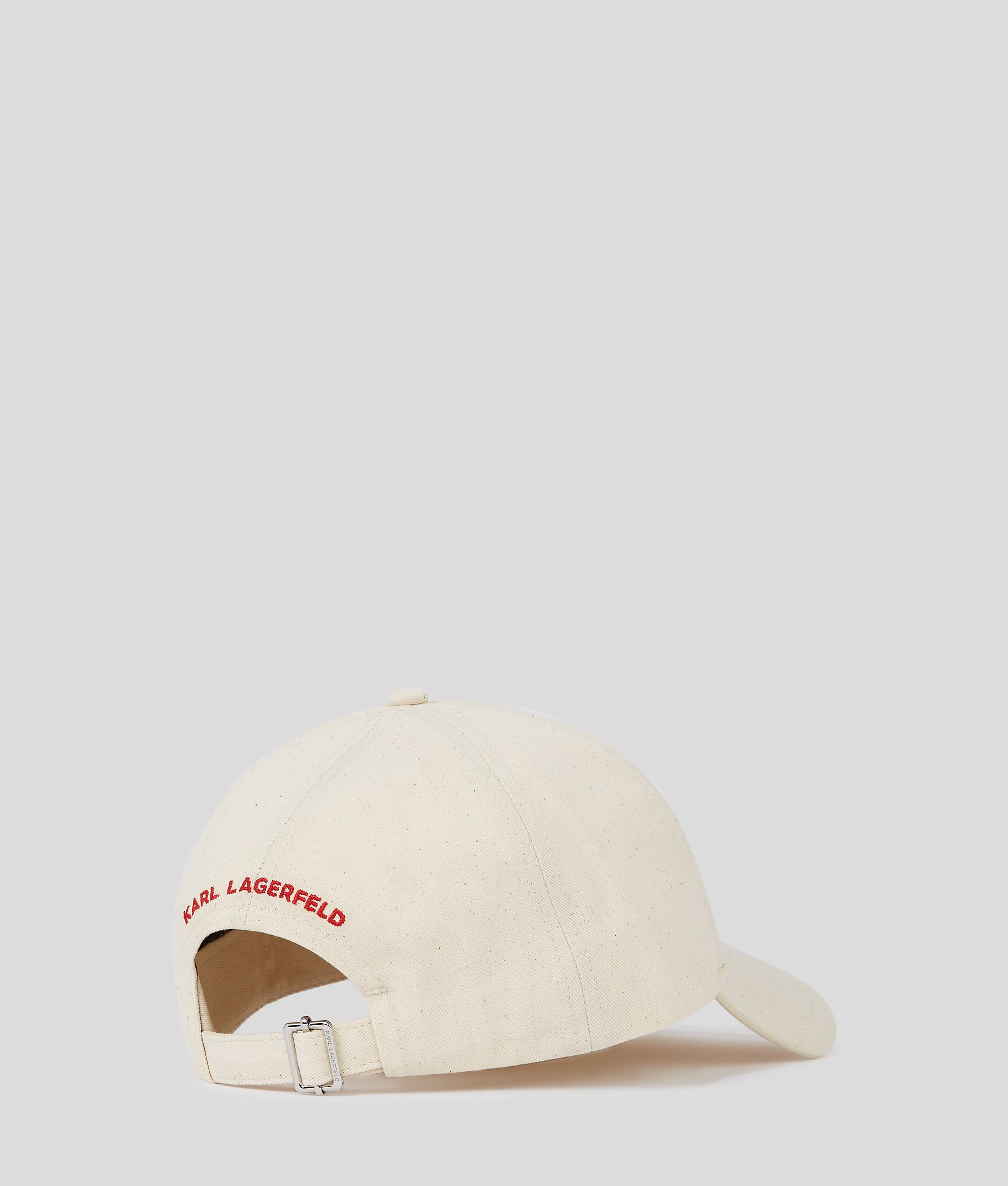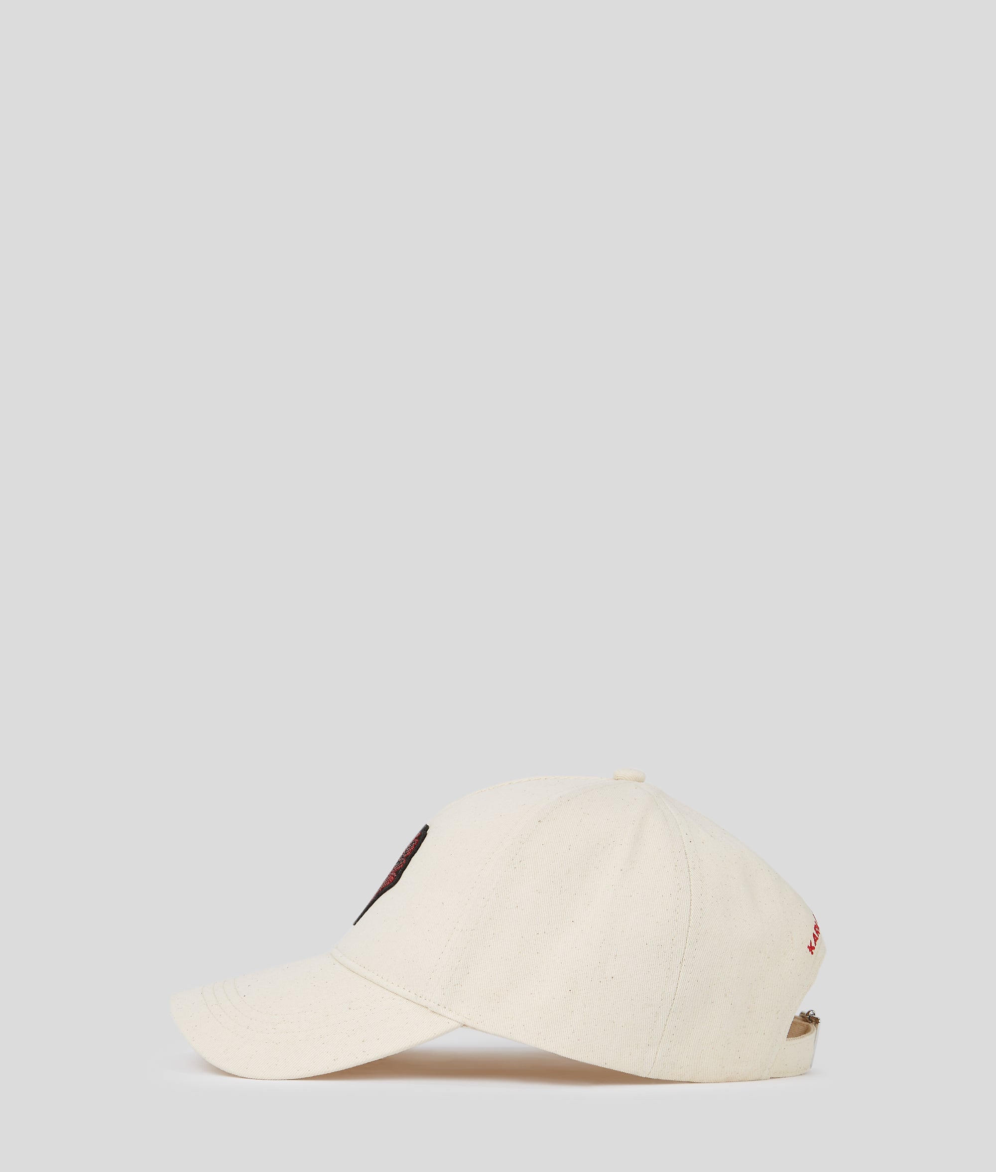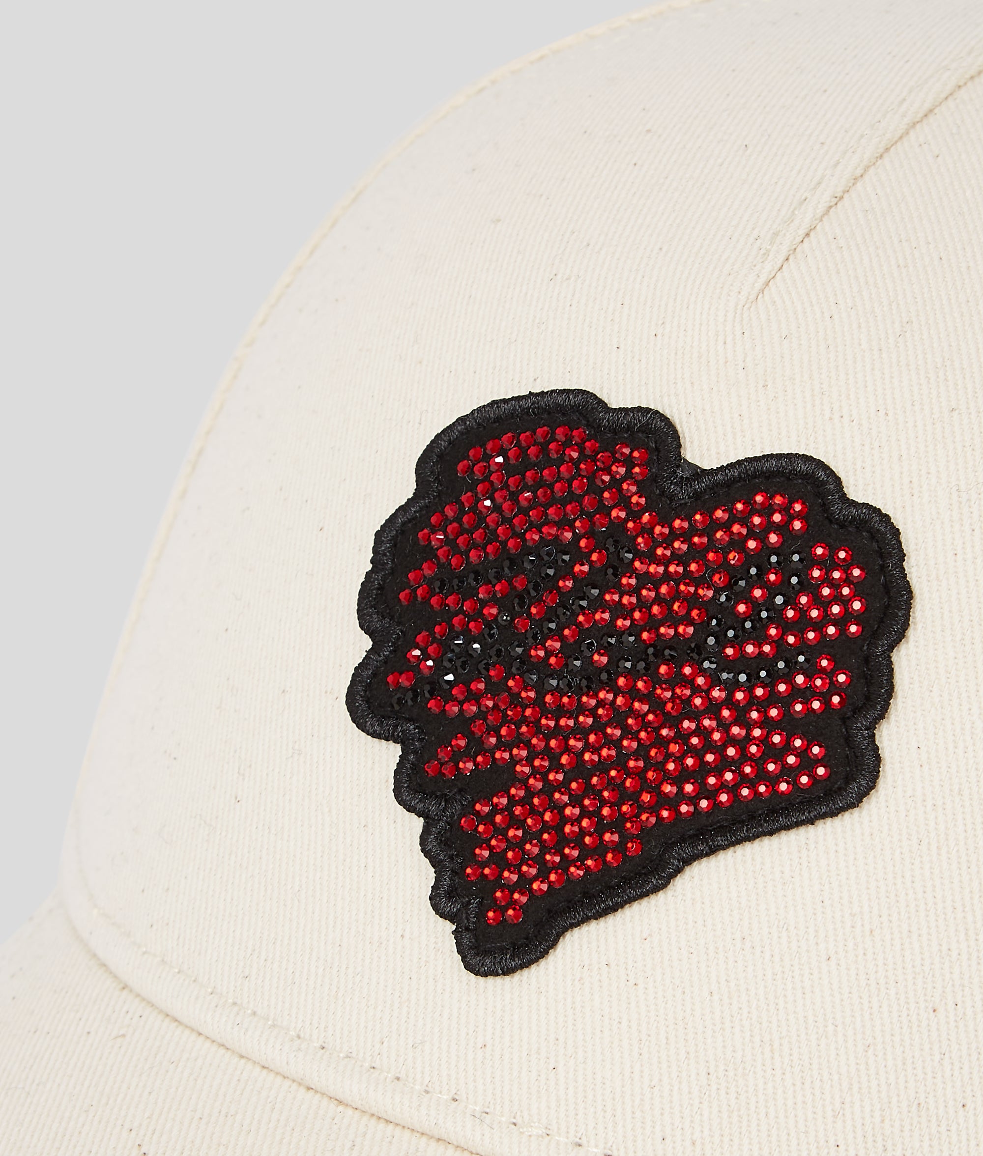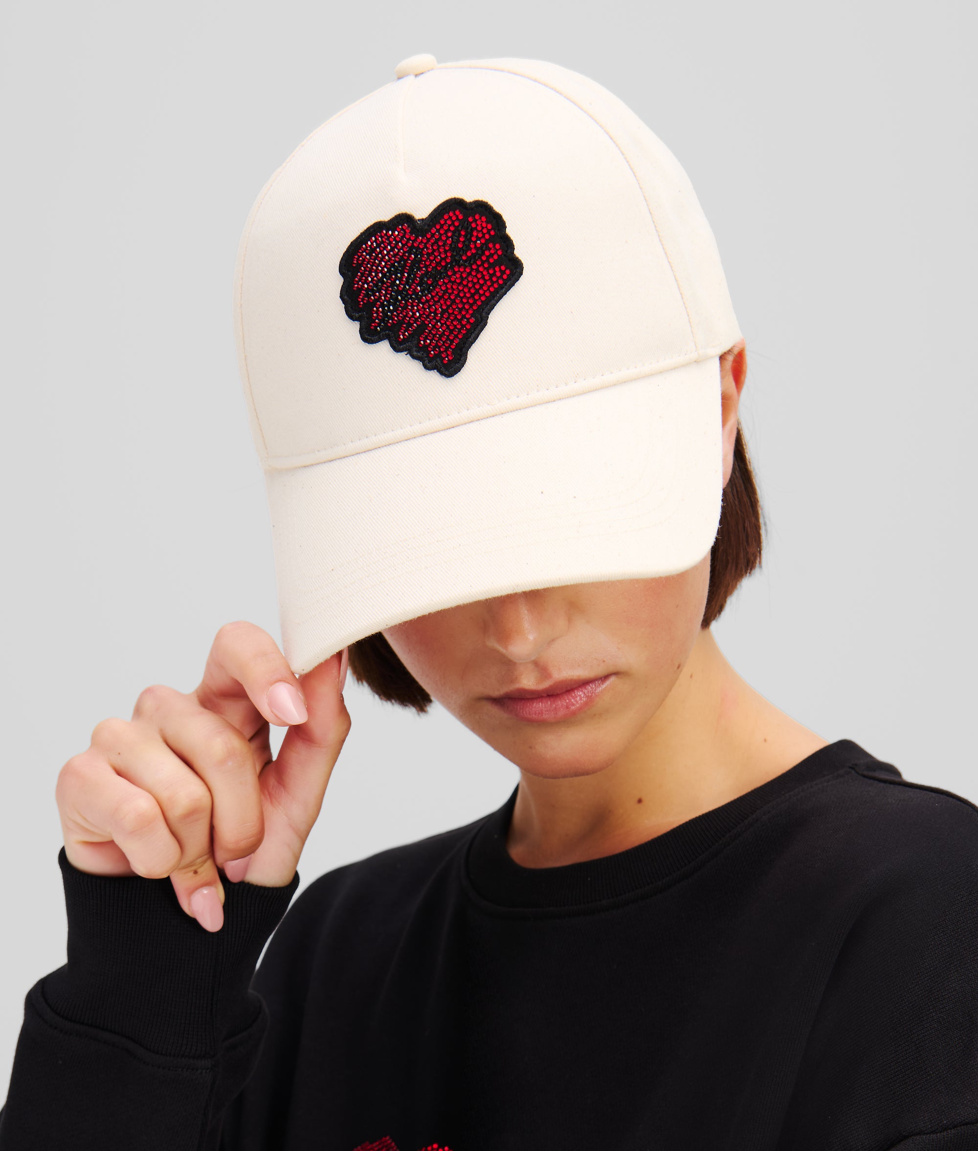 A shimmering rhinestone heart with a scribble-effect KARL Signature logo adorn this classic cap. embodying a charming blend of style and whimsy. An ideal gift for someone special.