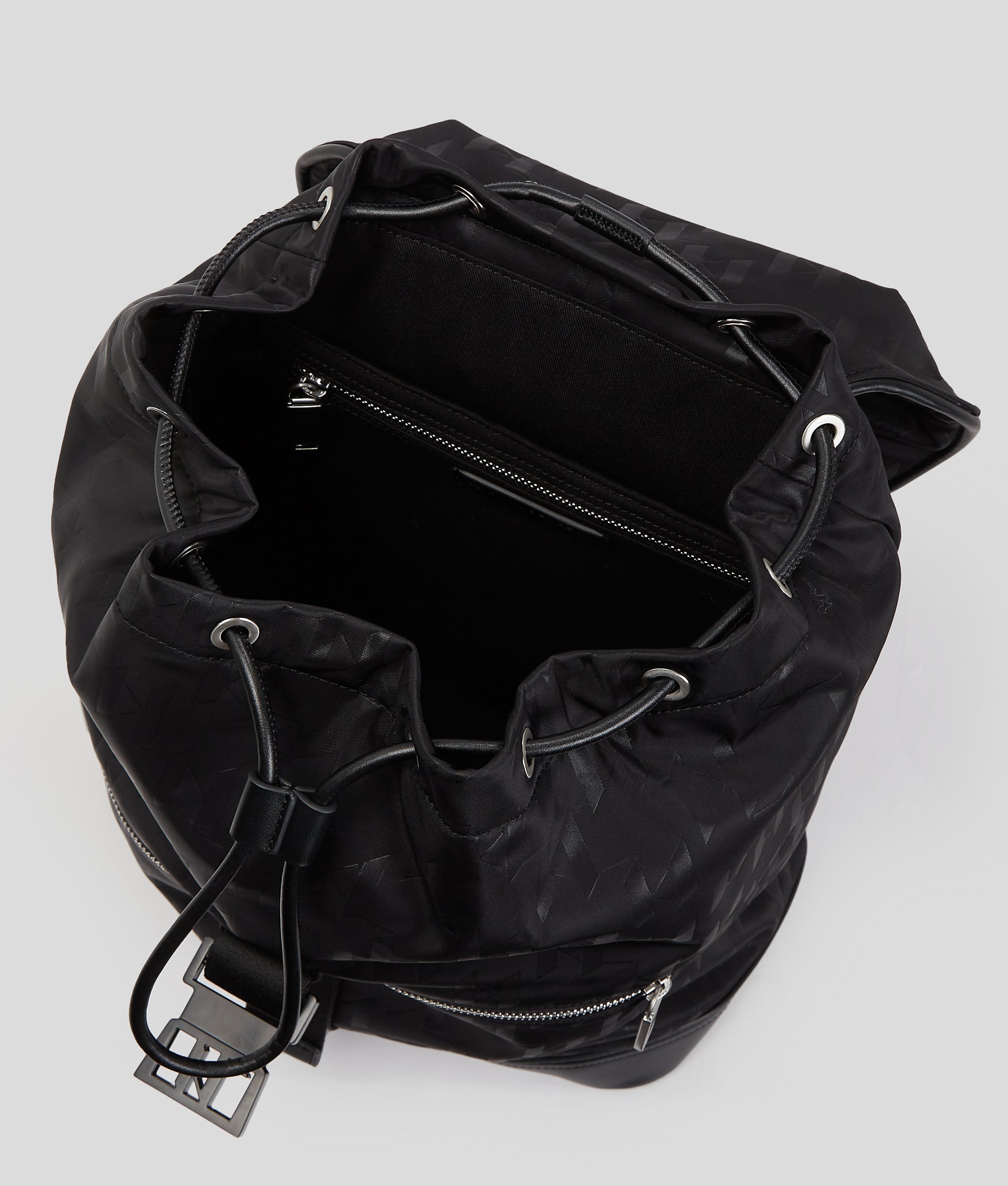 Introducing a sleek backpack showcasing an all-over Karl Monogram design. The buckle flap closure ensures your essentials stay secure. while multiple zipped pockets and an inner laptop compartment make organization effortless.
