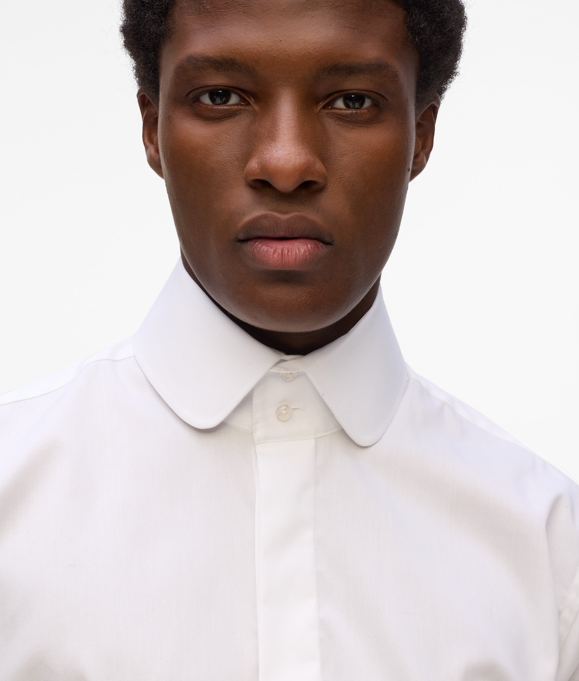 A woven shirt with a modern rounded collar and deep cuffs. subtly elevated by a discreet logo detail and a clean. concealed button front.